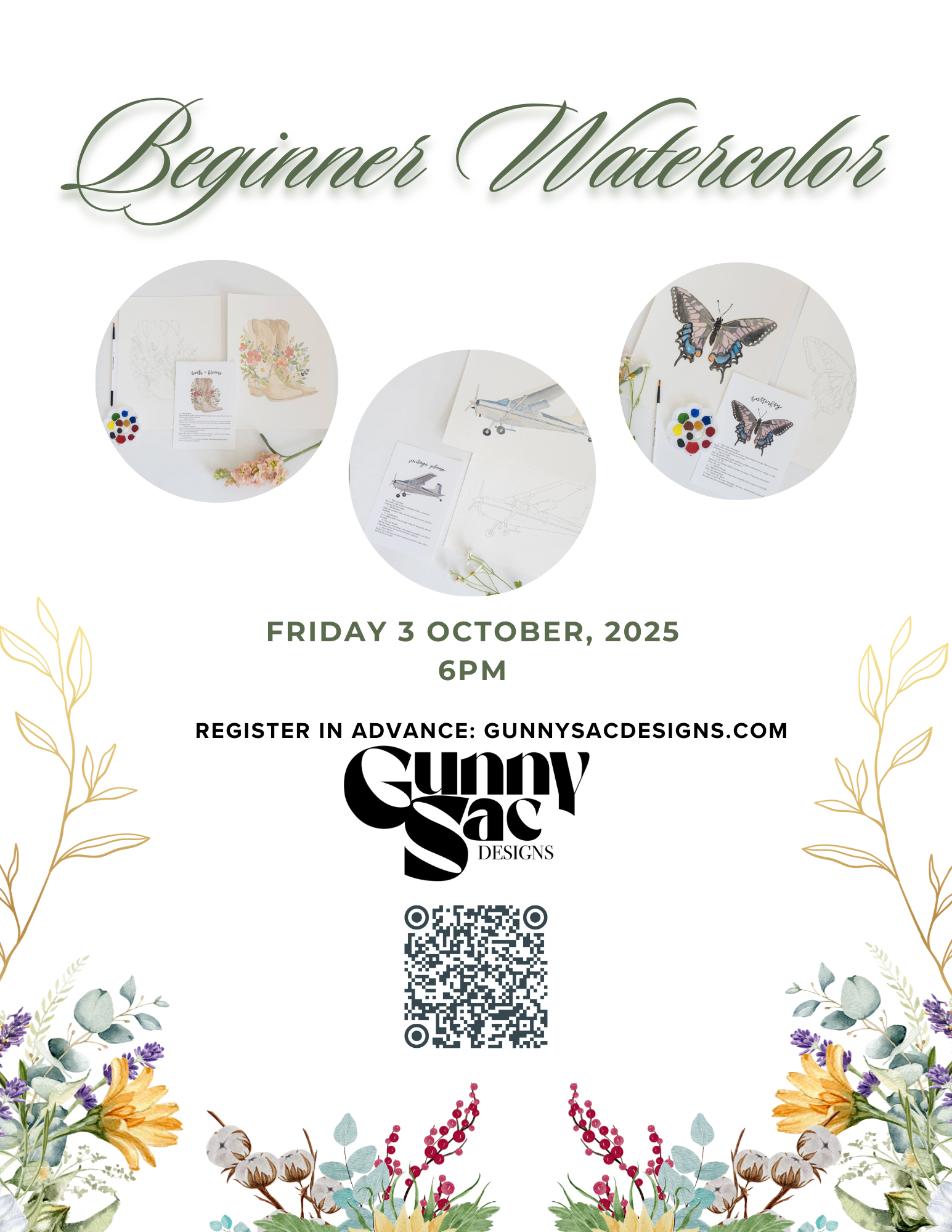 Join the Beginner Watercolor Class at GunnySac Designs in Washington, IA on October 3, 2025, at 6pm. This session offers expert guidance as you explore watercolor techniques, choosing from three unique sketches to create your own artwork. Perfect for those new to watercolor, you'll gain foundational skills in a supportive environment.